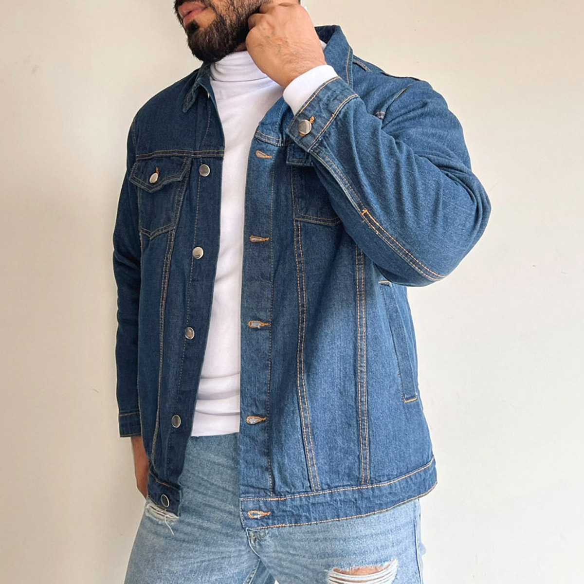 A denim jacket is a timeless wardrobe staple known for its durable fabric and effortless style. It typically features sturdy stitching, metal buttons, chest flap pockets, and a structured collar that adds a classic touch. Versatile and easy to layer, a jeans jacket pairs well with casual outfits while adding a cool, rugged edge to any look.