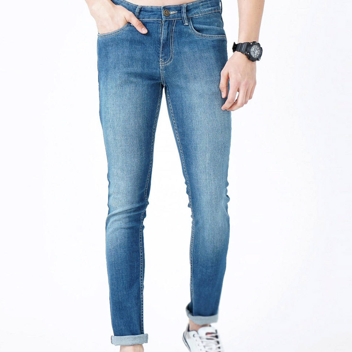 Denim jeans are durable trousers made from sturdy cotton denim fabric, known for their strength and timeless style. They typically feature a zip or button fly, belt loops, and multiple pockets, often reinforced with metal rivets for added durability. Originally popularized as workwear, denim jeans have evolved into a global fashion staple available in various fits and washes.